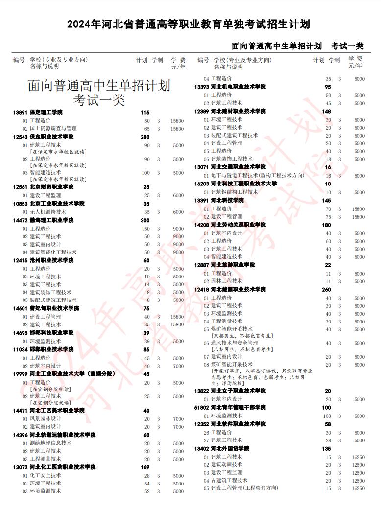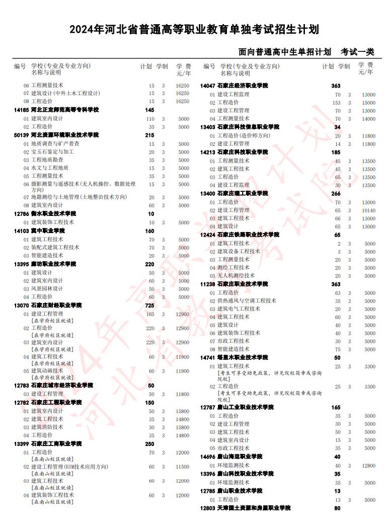 2024年河北省高職單招考試一類招生計劃