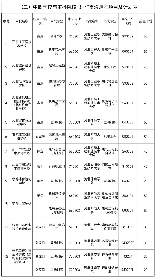 河北省教育廳關(guān)于2025年3+2大專、3+4本科、五年一貫制招生計(jì)劃的公示,根據(jù)《關(guān)于做好職業(yè)學(xué)校2025年貫通培養(yǎng)項(xiàng)目工作的通知》(冀教職成〔2025〕4號)和《關(guān)于開展“3+2”“3+4”貫通培養(yǎng)項(xiàng)目教育質(zhì)量評價(jià)工作的通知》(冀教職成函〔2024〕15號)要求,在各市及省屬職業(yè)院校就2025年擬舉辦的貫通培養(yǎng)項(xiàng)目進(jìn)行申報(bào)和備案基礎(chǔ)上,經(jīng)研究,確定了2025年“3+2”“3+4”“5年一貫制”貫通培養(yǎng)項(xiàng)目及招生計(jì)劃(詳見附件),現(xiàn)予以公示,公示時間為4月7日-11日。