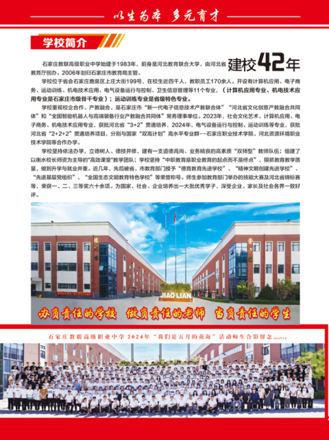 2025年石家莊教聯(lián)高級(jí)職業(yè)中學(xué)創(chuàng)建于1983年,是一所有42年辦學(xué)歷史的學(xué)校,學(xué)校位于石家莊鹿泉區(qū),開設(shè)11個(gè)專業(yè),其中,計(jì)算機(jī)應(yīng)用、機(jī)電技術(shù)應(yīng)用是石家莊市級(jí)骨干專業(yè),運(yùn)動(dòng)訓(xùn)練是河北省省級(jí)特色專業(yè)。