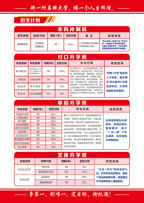 根據(jù)學(xué)生中考分?jǐn)?shù)開設(shè):本科沖刺班,要求480分以上,對(duì)口升學(xué)班,要求380分以上,單招升學(xué)班要求200分以上,愛好美術(shù),書法,運(yùn)動(dòng)訓(xùn)練,武術(shù)等專業(yè)的學(xué)生可以填報(bào)我們的藝體升學(xué)班!